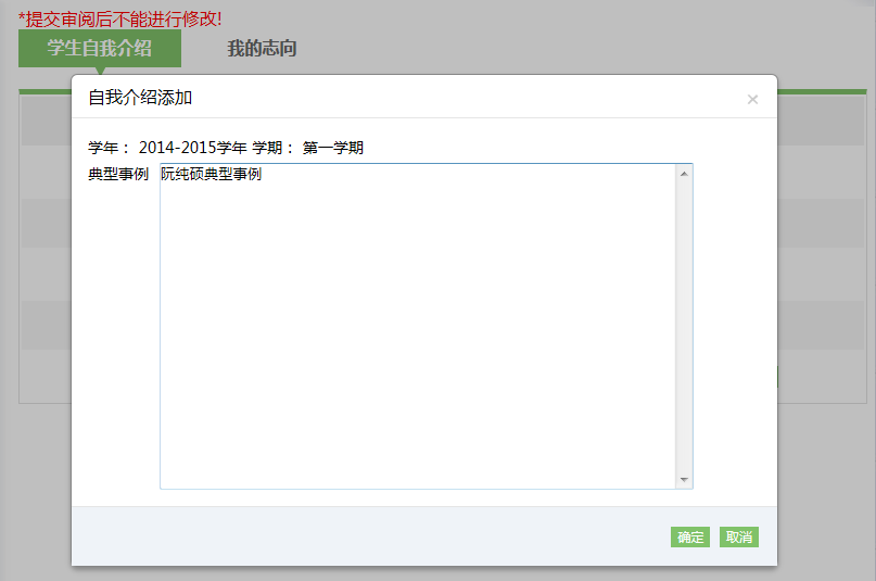 4、班主任审阅未通过的,在填报周期内,点击“修改”按钮,进入“自我介绍修改”界面,可对典型事例进行修改。修改完成后,点击“确定”按钮,系统提示修改成功。再次点击“提交审阅”按钮,等班主任审阅后点击“确认”按钮。